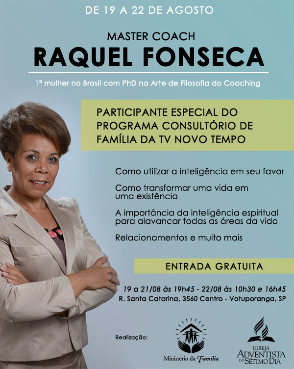 De 19 a 22 de agosto receberemos na Igreja Adventista do Sétimo Dia Central de Votuporanga a Master Coach Raquel Fonseca, 1ª mulher no Brasil com PhD na Arte de Filosofia do Coaching.